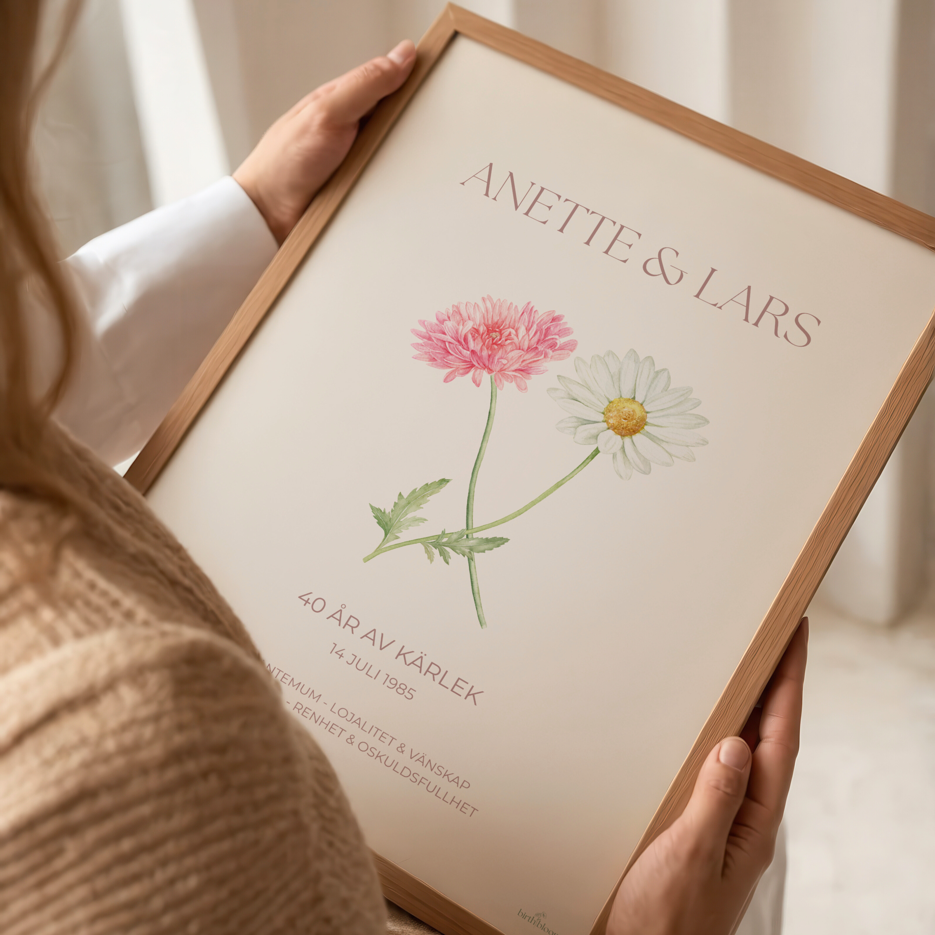 Strunt i att köpa en juicepress eller en salladsskål till brudparet! I postern "The duo" samlas deras månadsblommor och innebörd, bröllopsdatum och ett fint budskap om deras kärlek. Bättre present än så hittar man inte!