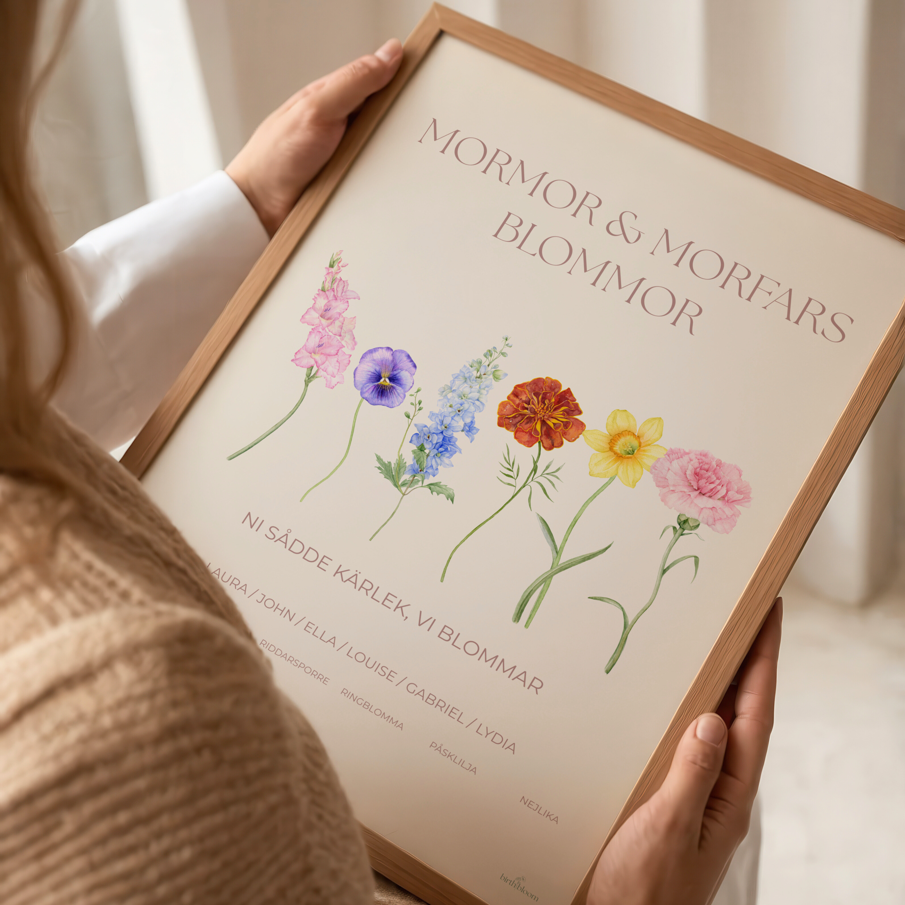 Få farmor att gråta av glädje när hon öppnar sin present! Vad mer rörande än en tavla med alla barnbarnen samlade och ett fint budskap om att de är hennes blommor som hon satte rötterna till? PERFEKTA julklappen.